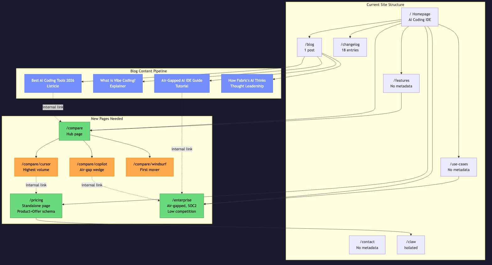 Goal: Maximize organic traffic and AI search visibility for Fabric's AI Coding IDE Current state: Strong product, weak SEO — zero structured data, no sitemap, missing meta on key pages, invisible to AI search engines, absent from every competitor comparison article Timeline: 6-week sprint + ongoing monthly cadence