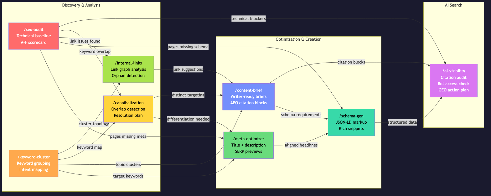 The 8 SEO skills feed into each other in a specific workflow: