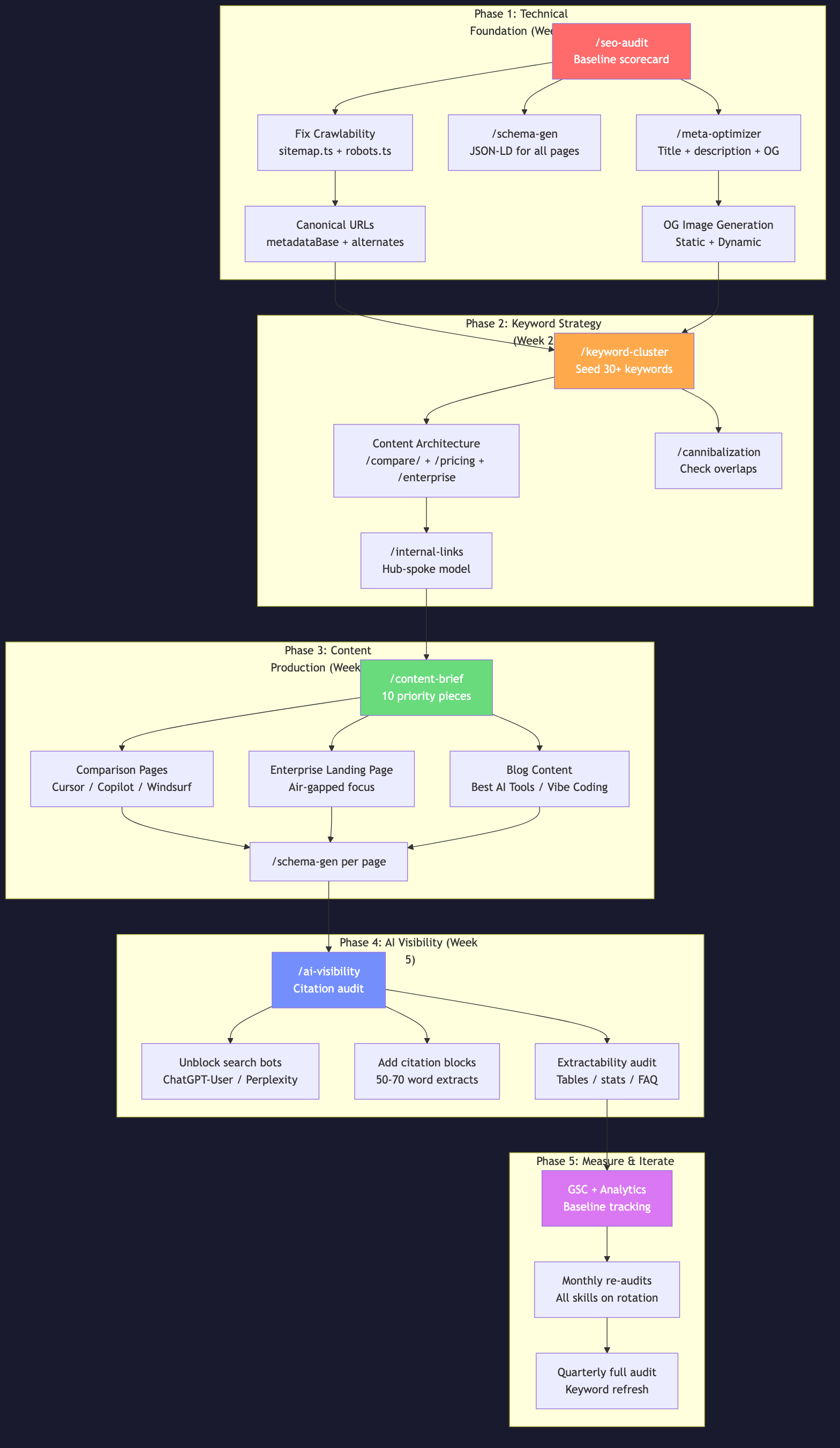 The strategy has 5 phases executed over 6 weeks, with each phase building on the previous. Every phase maps to specific SEO skills installed in this project.